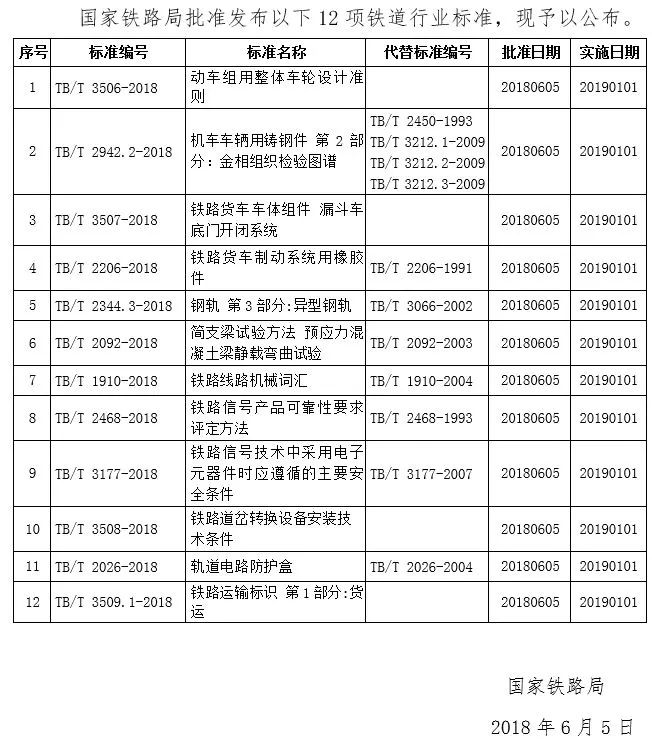 國家鐵路局關(guān)于發(fā)布鐵道行業(yè)標準的公告(技術(shù)標準2018年第4批)國鐵科法〔2018〕49號